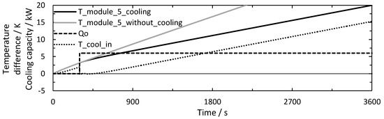 Figure 13 shows the simulation results for a charging rate of 1 C (250 kW). For the case without cooling, the battery cell temperature increases up to 20 K within 2200 s, whereas a cooling capacity of 6 kW reduces the temperature rise to 20 K after it is fully charged. The coolant is also heated up considerably in both cases and thus reduces the cell temperature rise. However, the results clarify that a 6 kW cooling capacity is not sufficient for a 1 C charging rate, and hence, lower C-rates are recommended for the system under consideration.