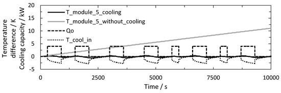 Figure 14 highlights the simulation outcome for fifteen repeated sequences of the SORT2 driving cycle. Without cooling, the cell temperature increases over 10 K after 2 h and 46 min. Taking temperature control into account, the cell temperature is within a range of ±1 K and a quasi-stationary state is reached. This result is particularly interesting as it indicates a sufficient control of the battery cell temperature via a simple proportional controller with quasi-stationary cooling between 4 kW and when it is switched off. A possible reason for this circumstance is the slow dynamic of the thermal system discussed in Section 3.1.