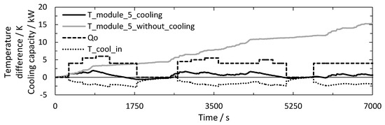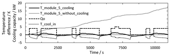 Higher and longer cooling rates are required for the driving profile of line 84 due to higher heat production. The results are outlined in Figure 16. The cell temperature is controlled within a range of ±2 K by quasi-stationary operation of the cooling unit. Without cooling, the temperature rises up to 15 K after 1 h and 54 min, underlining the need for an active cooling application.