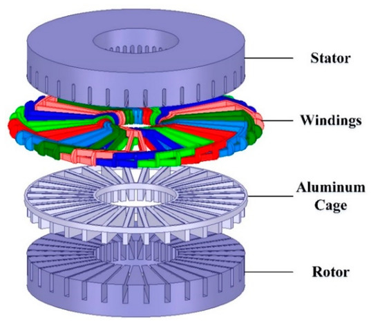 With the developing technology, electric motors have a more compact structure and many studies are carried out to increase their efficiency. In many studies, instead of radial flux design of induction motors, axial flux design was found to have a more compact structure and it was concluded that their efficiency and torque density could be increased further [14,15].