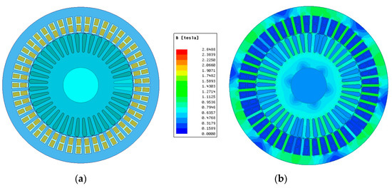 Firstly, an AFIM designed with the same number of stator and rotor slots. AFIM model and the magnetic field density of AFIM is shown in Figure 4. This model is designed with a non-skewed rotor. According to the analysis results, the efficiency of AFIM is 82.83%, while the torque ripple is 7.4%. Thereafter, in the next section, AFIMs are designed with different rotor slot numbers and various skewed rotors to increase the efficiency to IE3 efficiency class. Table 3 shows the general design parameters of the analyzed AFIMs.