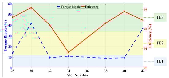 It is known that torque ripple is one of the most challenging parameters in electrical machine designs. While making designs, decreasing this value is an aim. Therefore, torque ripples are taken into consideration while making comparisons. Figure 5 shows the efficiency and torque ripples of the analysis results according to 7 different slot numbers from 28 to 42. In Figure 5, torque ripple in 30 and 42 slotted AFIMs varies a lot compared to others. As the reason for this, it can be said that the number of these two slots is a multiple of 6; that is, the pole number. Thus, they are forced more in magnetic field transition. From the other five AFIMs, the torque ripples of only 28 and 34 slotted rotor designs are over 10%, while the other three designs’ torque ripples at 9%. In this way, AFIM models with the best performance in terms of torque ripples are 32, 38 and 40 slotted models. There are six models in the same energy efficiency class (IE3) as RFIM. Only 34 slotted model is in a lower efficiency class (IE2).