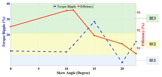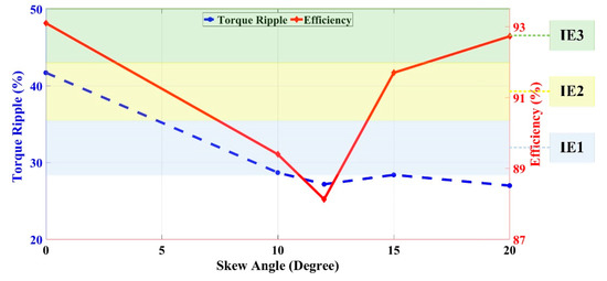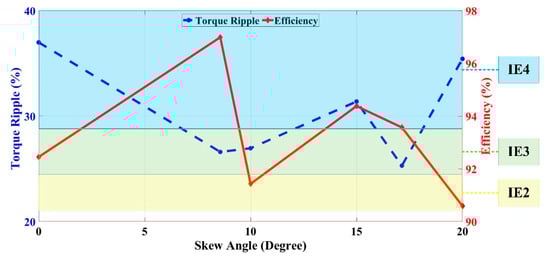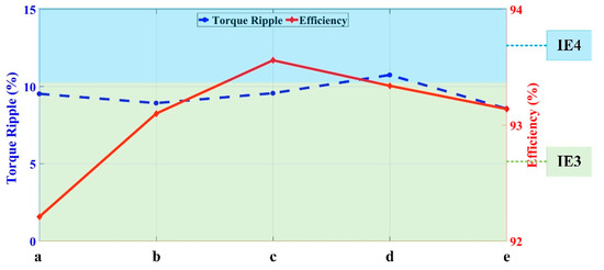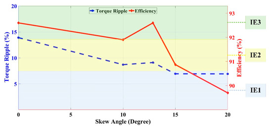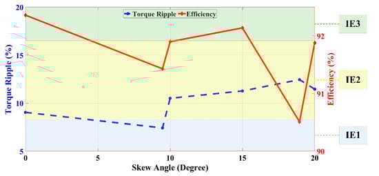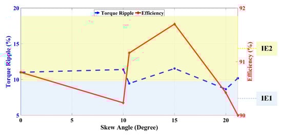 In the sixth analysis step, the skew applied to the rotor of the 40-slot AFIM, which has the second best efficiency among non-skewed models. This model is also in IE3 energy efficiency class and the only model with low torque fluctuation. Skew angles for this model are calculated as 9°, 10°, 15°, 18° and 20°. Figure 11 shows the torque and efficiency results of the non-skewed and skewed models. In Figure 11, the 18° skewed model has the best torque ripple percentage. It can be seen that giving a skew to the rotor of 40-slot AFIM affects the efficiency negatively. However, the non-skewed, 9°, 10°, 15° and 18° skewed models are in IE3 energy efficiency class, other 10° and 20° skewed models are in IE2 energy efficiency class.