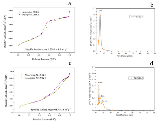 Barret–Joyner–Halenda (BJH) sorption isotherms (with P0 = vapor pressure of the adsorbate) and pore size distributions of CMK-8 and N-CMK-8. (a) Absorption and Desorption Curves of CMK-8, (b) Pore size distribution of CMK-8. The distribution peak is centered at 4 nm, (c) Absorption and Desorption Curves of CMK-8, (d) Pore size distribution of N-CMK-8. The distribution peaks are centered at 4.2, 6.2 and 9.2 nm.