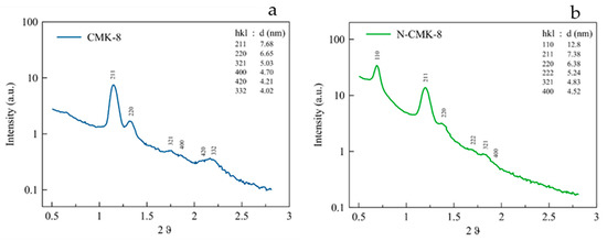 In the wide X-ray diffraction patterns of the CMK-8 and N-CMK-8 powders, reported in Figure A1, the materials showed two broad peaks ~25 and ~43. Those peaks were related to (002) and (100) diffractions, respectively. However, the wide-angle XRD was not resolutive for ordered, structured carbons as CMK8. Therefore, the materials were characterized by small angle X-ray scattering (SAXS).