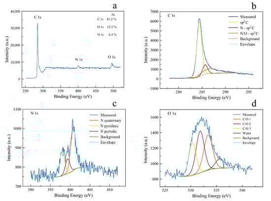 XPS spectrum of N-CMK-8 with relative surface elemental composition. (a) Full spectrum; (b) high-resolution of C 1s, (c) high-resolution of N 1s, and (d) high-resolution of O 1s.