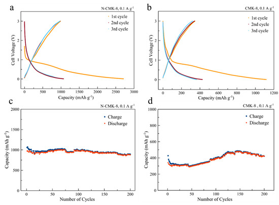 Voltage profiles for the first 3 cycles of (a) N-CMK-8 and (b) CMK-8. Long-term specific capacities of (c) N-CMK-8 and (d) CMK-8.
