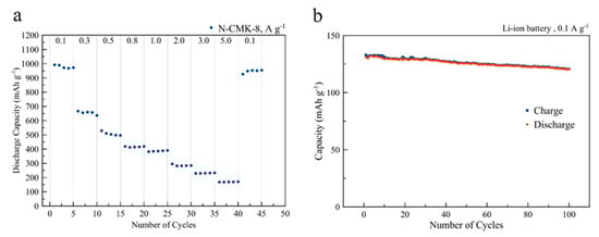 Figure 4c,d report the charge and discharge capacities vs. cycles number at 0.1 A·g−1 for the two carbons. The increase in capacity of the CMK-8, after the initial 10 cycles of irreversible formation of the SEI, is likely due to a better infiltration of the electrolyte inside the mesopores of the material as cycling proceeds. For the N-CMK-8, the SEI formation is reduced, probably due to a combination of the broader porosity and the increased polarity of the nitrogen-functionalized surface. The N-CMK-8 shows very good reversible performance and stability for 200 cycles, being competitive compared to different N-doped carbon materials reported in the literature (see Table 1).