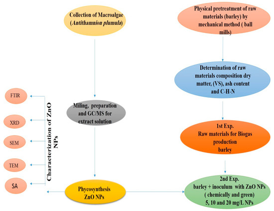 Barely straw was used as a substrate for this work. An inoculum was obtained from a mesophilic biogas plant in Puglia, Italy. Red algae (A. plumula) for ZnO NPs synthesis was collected from the coast of Baltic Sea, Kiel City, Germany (54°453789″ N, 10°197037″ E) in the spring of 2018. The barley cultivation (Hordeum vulgare L.) was done at the experimental farm in Puglia, Italy, and was harvested in the spring of 2018. Standard methods [27] were applied for the determination of total solids (TS), volatile solids (VS), and ash content. The C, H, and N measurement was done by the elemental analyzer (LECO Model CHN 628).
