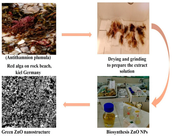 Phycosynthesis route of ZnO nanoparticles (NPs) from A. plumula extracts.