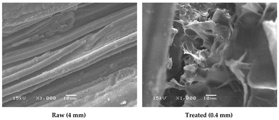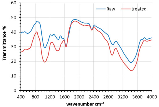 The FTIR shows the overlapping spectra of raw and mechanically pretreated barley straw in Figure 4. The decrease in intensity spectrum of pretreated barley in comparison with raw barley straw in the bands at 1060–1645 cm−1 and the broadband at 3000–3820 cm−1 suggests the occurrence of deformation in the chemical structure of pretreated barley straw as a result of applying mechanical degradation of lignocellulose [40].