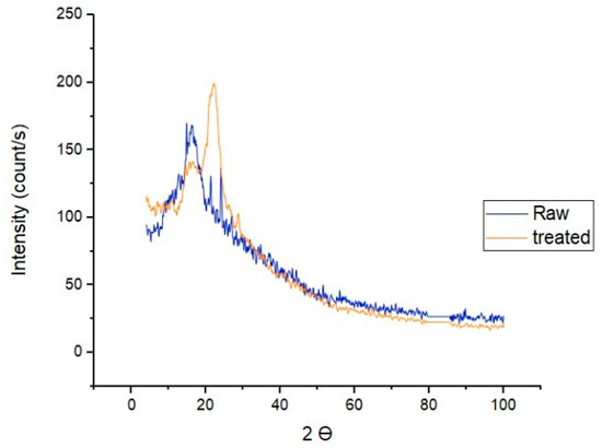 X-ray diffraction analysis is carried out to evaluate the crystallinity degree of the raw and pretreated barley straw, as shown in Figure 5. The crystallography exhibits that the peak intensity of the raw barley sample is at 15.5 and shifts to 22.4 after mechanical pretreatment. A small peak appears post-pretreatment, observed at 15.5, and this corresponds to crystalline cellulose II. The composition of the biomass is highly influenced by crystallinity. The raw material has the lowest relative crystallinity as it has a higher amorphous content of hemicellulose and lignin, and the barley with a high content of lignin and hemicellulose is the barley that presents lower crystallinity, and it could be evidenced that the crystallinity of the pretreated barley increases when treated mechanically [41].