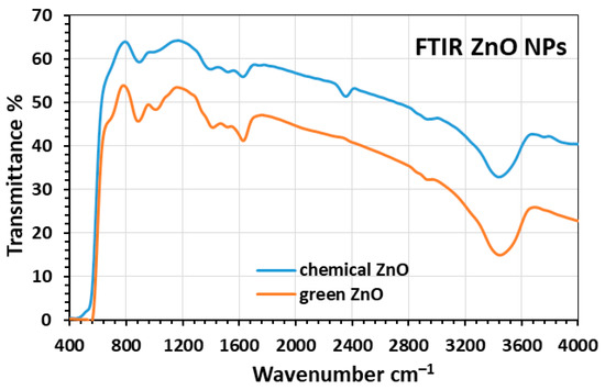 The FTIR spectrum of chemical and green synthesized ZnO NPs.