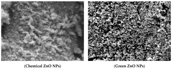 SEM micrograph of chemical and green synthesized ZnO NPs.
