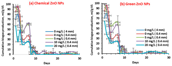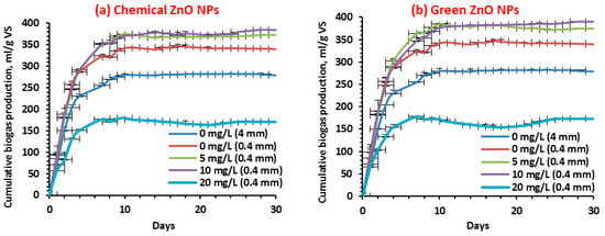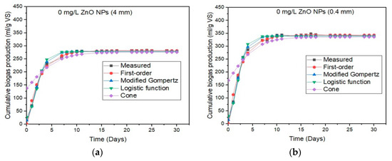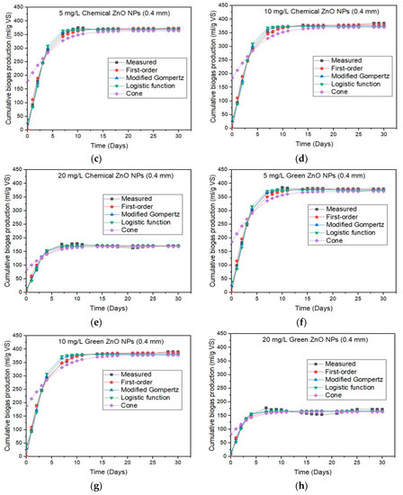 In this work, the novel designed synthesis procedure based on macroalgae extract for the green synthesis of ZnO NPs with small particle sizes is environmentally friendly, economically affordable, and predominant, preventing using unsafe materials, which are common in conventional chemical methods [22,23]. Four kinetic models—the first-order kinetic, the modified Gompertz, the logistic function, and Cone models—were reported to represent and reproduce the experimental data. However, to the best of our knowledge, the study on the kinetics of biogas production under the influence of NPs stress does not exist. The accuracy of these models was compared by statistical analysis of correlation coefficients (R2).