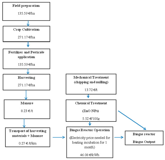 The economic feasibility of biogas production depends on the possible income from the produced biogas versus the total cost of production. Both investment and operational costs, including biomass supply, are affected by several site-specific conditions. The cost-benefit analysis performed in this study was based on the whole chain of crop cultivation (preparation of land, planting, pesticide, and fertilizer), harvesting, transport, and conversion of the crops at a biogas plant. The costs for these variables are based on prices in Egypt, where the electricity price is 0.064 €/kWh, the total cultivated area for barley crop is 101,172 ha, with an average yield of 2.96 t DW/ha (personal communications with Egyptian agriculture ministry). Biogas contains roughly 50–70 percent methane, 30–40 percent carbon dioxide, and trace amounts of other gases. In this work, we used 60% for methane production as the proposed percentage to calculate the cost benefits analysis [38]. Moreover, in this work, we used a 40% efficiency of conversion from the literature [39]. Scheme 1 shows the different parameters considered for the cost-benefit analysis.