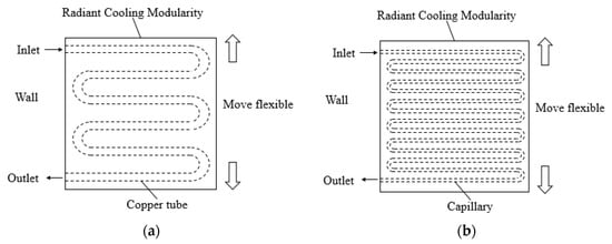 The radiant cooling system in the current market could be mainly divided into the following three types: radiant floor cooling system [27], radiant cooling ceiling system [28], and wall cooling system [29]. The pipe can be embedded into the building structures or slab, and the radiant terminal always occupies the entire surface. A novel type of modular radiant terminal is proposed, which refer to copper tube radiant cooling (CTRC) terminal and capillary radiant cooling (CRC) terminals, as shown in Figure 1.