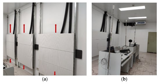 The modular radiant cooling system comprised six independent radiant panels installed on the wall. The single radiant module is 1.5 m in width and 1.0 m in length. The top surface of the radiant module is a galvanized steel sheet with a water tube attached behind. There are two kinds of water tube, copper tube and capillary (material is PPR (pentatricopeptide repeats)), with 0.012 m in diameter and 0.1 m pipe spacing and 0.004 m diameter and 0.01 m pipe spacing, respectively. The bottom panel is covered with a 0.05 m thick thermal insulation layer to ensure that the heat transfer from the water to the panel is maximized. Each radiant module can be moved on the wall in the vertical direction and controlled individually, as shown in Figure 2. The inlet and outlet of each modular radiant terminal are connected to a water separator and water collector, respectively. The water supply system for radiant cooling panels is composed of an air source heat pump, buffer tank, water pump, valves, water separator, water collector, flow meter and other accessories.