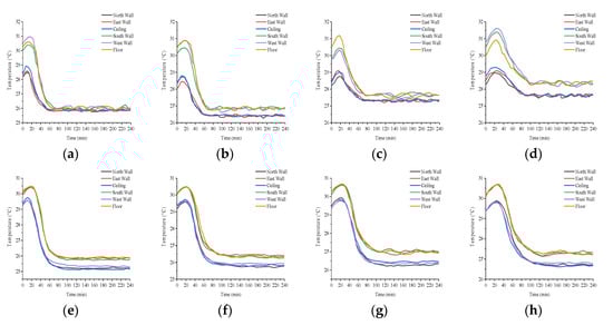 We measured the temperature of walls, ceiling, and floor when the supply water temperature of the radiant cooling system ranged from 12 °C to 19 °C. In addition, we selected four typical conditions (i.e., 12 °C, 14 °C, 16 °C, and 18 °C) in this study. Figure 5 shows the comparison of the temperature change of envelope over time under different supply water temperatures with two types of radiant cooling terminal. We observed a similar trend of the temperature change of envelope over time in the CTRC and CRC. The surface temperature of the envelope slightly increased first, then decreased gradually, and finally reached a steady state. The envelope temperature variation indicates a thermal delay during the operation of radiant cooling, regardless of the type of radiation terminal used. The structure characteristics of the terminal of radiant cooling present a large thermal resistance compared with the terminal of convective air conditioning. The thermal hysteresis phenomenon of the envelope exists in the initial stage of the cooling room due to the weak heat transfer. Moreover, the temperature of the envelope will continue to rise because of the thermal inertia interference. The surface temperature of the envelope gradually decreases after the system runs for a period of time to increase the cooling capacity of radiant terminal. The surface temperature of the envelope seems to be steady when the thermal balance of the indoor environment occurred.