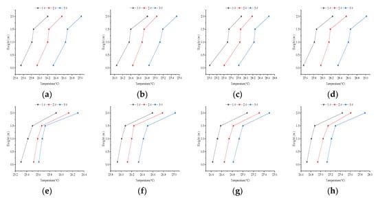 The indoor air temperature distributions under different supply water temperature with CTRC ((a–d) for 12 °C, 14 °C, 16 °C and 18 °C, respectively) and CRC ((e–h) for 12 °C, 14 °C, 16 °C and 18 °C, respectively).