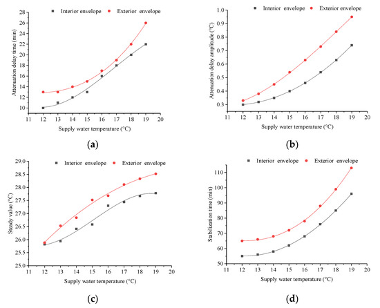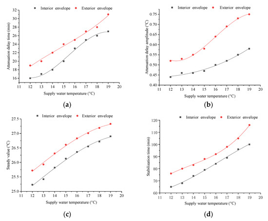 Results in Figure 7 depict the thermal response characteristics of the envelope under different supply water temperature when the CTRC system is adopted. Results show that the difference in attenuation delay time and stabilization time of the interior and exterior envelopes decreased at low (below 16 °C), and increased at high supply water temperatures (above 16 °C). The difference is minimal when the supply water temperature is approximately 16 °C. The difference in attenuation delay and temperature stability increases with the increase in supply water temperature. At the initial operation stage of the radiant cooling system, the interior envelope transfers heat from indoor to outdoor because the adjacent rooms are air-conditioned. With the continuous operation of the radiant cooling system, this process gradually weakened until the thermal balance is reached, resulting in a delay in the attenuation of the surface temperature. A low supply water temperature leads to a great radiation heat transfer between the radiant cooling module and the envelope because an exponential relationship exists between radiation heat transfer and surface temperature. In addition, the surface temperature of the envelope changed dramatically with a decrease in supply water temperature. The thermal influence of the radiant cooling system on the envelope is weakened for the significant decrease in radiation heat transfer with the increase in supply water temperature. Therefore, the minimum value for the difference in stabilization time between the interior and exterior envelopes exists with the increase in supply water temperature. Results in Figure 7 show that the temperature attenuation hysteresis and the steady velocity of the envelope are sensitive to a low supply water temperature. The temperature attenuation hysteresis of the envelope can be improved when the supply water temperature is reduced.