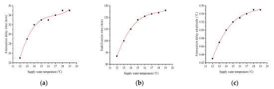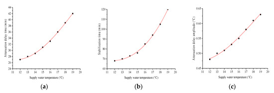 Change in attenuation delay time (a), stabilization time (b) and attenuation delay amplitude (c) of indoor air with different supply water temperature of the CTRC system.