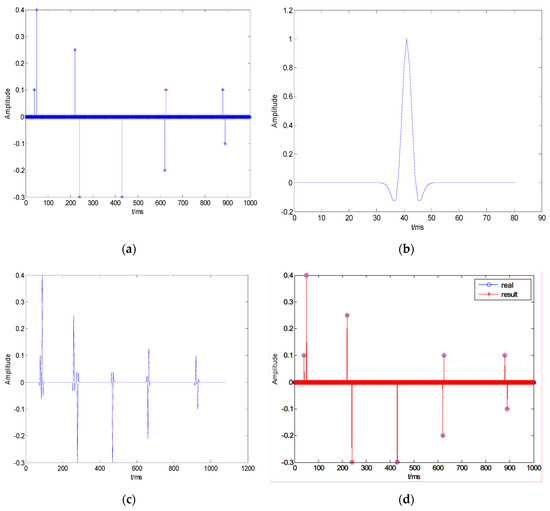 Inversion result of single-trace model data. (a) Reflection coefficient model; (b) Ricker wavelet; (c) synthetic seismogram; and (d) inversion result.