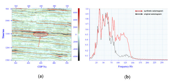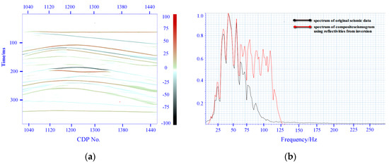 All the strata shown in Figure 5a can be found in the inversion result, and the lateral continuity of the reflection coefficient section is high. Besides, the amplitude spectrum of the synthetic seismogram is significantly widened compared with that of the original seismic data.