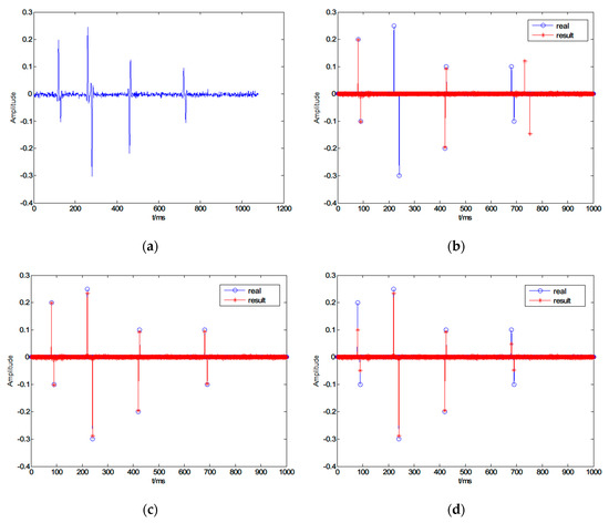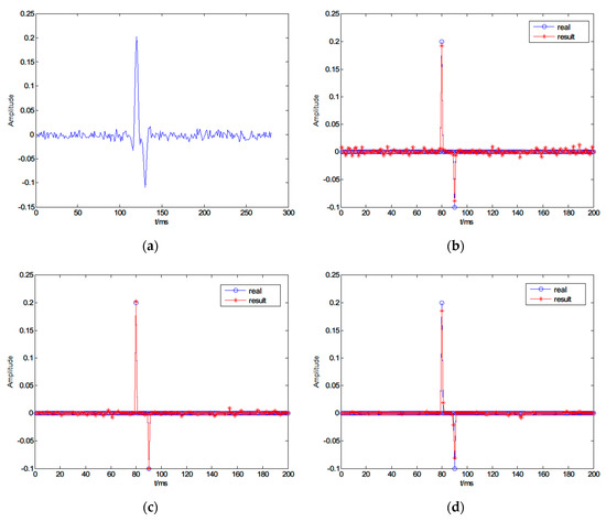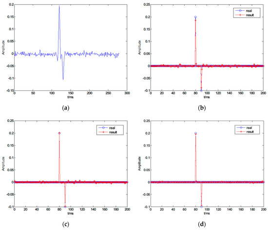 The seismic data used in the above numerical test do not contain any noise whereas the actual seismic data is inevitably affected by noise. In order to test the anti-noise ability of the proposed approach, we constructed a model with two reflection coefficients, which is shown in Figure 7a. Then, white noise with an amplitude equal to 5% of the seismic amplitude was added to the synthetic seismic data. We set (the regularization factor) to be 0.01, 0.04 and 0.08. The corresponding inversion results are showed in Figure 7b–d. Note that the type and parameters of wavelet used for the synthetic seismic data is consistent with those depicted in Figure 4.