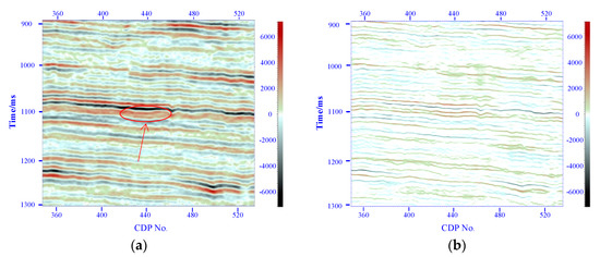 In order to evaluate the practical use of our algorithm, we applied the proposed method to 2-D field seismic data, which are shown in Figure 10a. The area inside the red ellipse represents the gas reservoir (target zone), and it is also the area that the interpreter focused on. The seismic data were acquired from the Sichuan basin, Northeast Sichuan, China, and consist of a common depth point (CDP) gather of 200 traces. The length of each seismic trace and wavelet are 400 ms and 81 ms respectively, and the sampling interval is 1 ms. The parameters are as follows: the regularization factor , the length of the time window is 120 ms, the sliding step is 250 ms, and the dominant frequency band is 5–90 Hz. The inversion result is shown in Figure 10b. It can be seen that the resolution of the obtained reflection coefficient section is very high and the lateral continuity is very good.