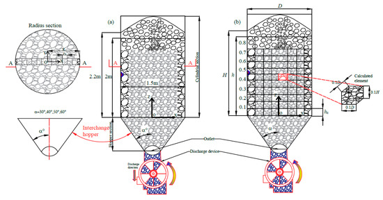 The vertical sinter cooling bed (VSCB) is the principal device for cooling red-hot sinter granular compounds from the sintering machine during the production process in the industry. During the cooling process, a large amount of sensible heat is produced, which is expected to be recovered to reduce energy consumption and mitigate the environmental impact. During the past decade, a considerable number of research papers have been developed in the field of VSCB, mainly focusing on thermodynamics parameters, such as the solid and gas inlet temperature, solid and gas inlet mass flow rate, aspect ratio of VSCB [1,2,3], and gas pressure loss [4,5,6]. Moreover, optimization studies have examined the coefficient of heat transfer [7,8] and exergy transfer [9,10]. Previous research has demonstrated few effects on improving the performance of heat transfer in VSCB. In actual production, the challenge of engineering problems limiting the performance of heat transfer in VSCB remains unresolved, which includes the external aspect of the serious air pressure loss and inferiority equality of heat resource recovery, prohibiting effective heat transfer between air and sinter granular compounds, and a worse internal aspect of the sinter granular flow pattern. In general, the flow pattern of sinter granular material comprises two distinct flow types, such as the mass flow and funnel flow pattern. A good granular material flow profile is considered to have the greatest influence, guaranteeing efficient work for enhancing energy utilization and reducing the maintenance cost. Thus, a comprehensive understanding of the dynamic evolution of the flow pattern in VSCB has a significant effect on improving the performance of heat transfer between air and sinter granular compounds. As reported in the literature, a numerical study of VSCB can simplify the conical silo structure, which is deemed a black box. Thus, information on the evolution of flow profile dynamics and the micro properties of inner granular compounds is very difficult to obtain. The conical silo structure has the advantages of a simple structure and ease of operation for extensive use. However, the behaviour of the granular material flow pattern inside the conical silo structure is complex, especially in VSCB, with a gas–solid counter-current flow in the heat transfer process. The granular flow pattern has a considerable influence on the even distribution of the gas–solid flow, thus optimizing the heat transfer between the cooling air and red-hot sinter material granular compounds. Therefore, investigating the effects of design factors on the evolution of sinter granular dynamics during the flow process to obtain the desired flow pattern is an important prerequisite for effectively improving the heat transfer performance in VSCB.