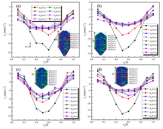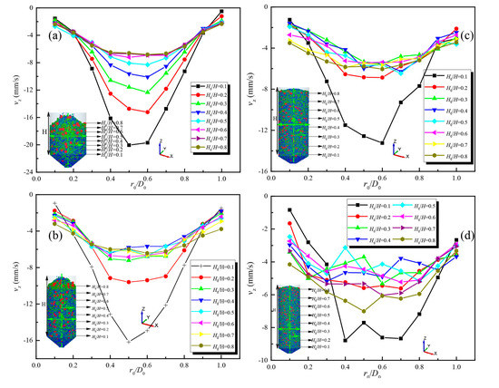 The evolution of the velocity of sinter layers as a function of radius position with different normalized outlets (d0/D0) is shown in Figure 10. The normalized outlet (d0/D0) is the ratio of the outlet of VSCB (d0) to the diameter of VSCB (D0). Figure 10 demonstrates that the velocity of the sinter layers increases with an increase in the normalized outlet and a decrease in the height of the sinter layers. It is possible that the obstruction of the contraction part is reduced with the increase in the normalized outlet. In addition, the velocity of the central region and region close to the sidewall dramatically increases with an increase in the normalized outlet, especially in the magnitude of the velocity with an increasing rate of the central part higher than that of the sidewall section. Therefore, the magnitude of the velocity difference between the central region and close to the wall section gradually increases with the aspect ratio onward. It should be noted that the variation in the velocity of sinter layers undergoes a tremendous fluctuation at a normalized outlet equal to 1, and the behaviour of the dynamic evolution of velocity has a negative effect on the smooth sinter layer flow export. Moreover, the difference in the variation in the velocity of sinter layers in normalized outlets between 3 and 4 is extremely small.