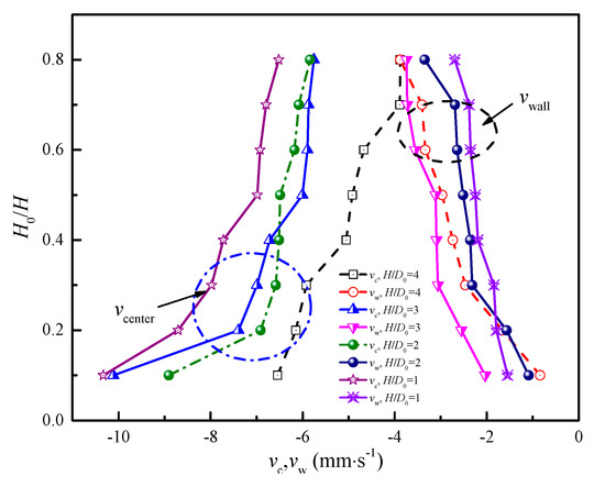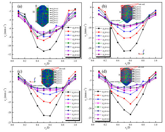 The aspect ratio is the ratio of the filling height to bed diameter (H/D0), which is considered a significant factor that influences granular velocity profiles, while granular flow profiles have an important impact on the gas distribution and heat transfer in VSCB. Therefore, a comprehensive understanding of the variation in granular flow profiles is the top priority and challenge in research on the current difficult problem of the flow pattern during the gas–solid heat transfer process. The evolution of granular flow profiles of different aspect ratios during the export flow process in VSCB is studied. The vertical velocity (vz) of the granular material is selected as a function of the normalized radius position (r0/D0) for different normalized sinter layer heights (H0/H), as illustrated in Figure 4. The similarity trend is shown in Figure 4, where the maximum velocity occurs in the center of the flow panel, and the minimum velocity is present in the vicinity of the wall with different height layers. Moreover, the granular velocity increases with the decrease in sinter layer height in the center of the flow passage, and the variation in velocity near the wall is the opposite. The granular flow velocity in the center of the flow passage is clearly obstructed, and the magnitude of velocity dramatically decreases with an increasing aspect ratio. In contrast, the granular velocity close to the wall gradually increases with an increasing aspect ratio. It should be noted that the velocity of the granular material in the vicinity of the wall is dramatically reduced during the discharge process, which is beneficial for aggregating the formation of the dead zone near the wall and has a deleterious effect on increasing the velocity difference between the center and near wall section in Figure 4a. Figure 4d also shows that the fluctuation of granular velocity among all the sinter layers is substantially aggravated when the aspect ratio of VSCB is increased.