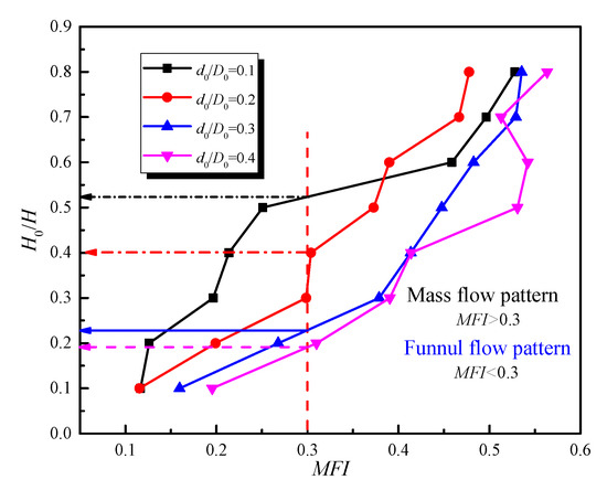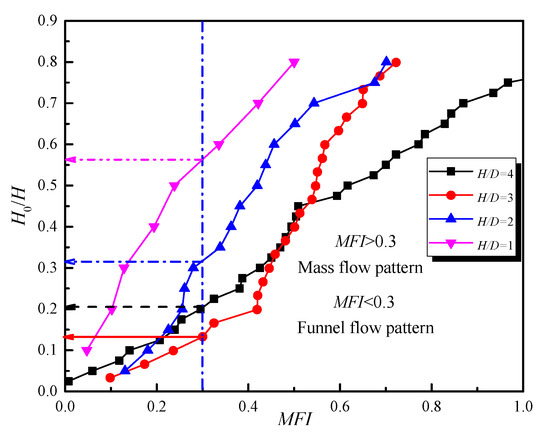 Figure 6 demonstrates that the evolution of MFI in the range of aspect ratio 1–3 presents a similar overall trend. From a normalized filling height onwards, the value of MFI starts to increase with minor fluctuations, while that in the aspect ratio of 4 gradually increases to nearly 0.6 at the normalized filling height in 0.5, after which it is projected to continue its upward trend more intensely to almost 1 by the top of the filling height. Figure 6 shows that the aspect ratios of 4 and 2 have nearly the same mass flow height (the height between the top of the filling height and the position of the flow pattern transition), showing nearly 70% of the total filling height. Regarding mass flow height, the aspect ratio of 3 presents the highest rate of 90% of the total filling height, while the corresponding value for the aspect ratio of 1 displays a mere 45% of the total filling height.