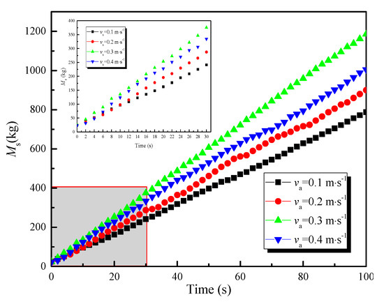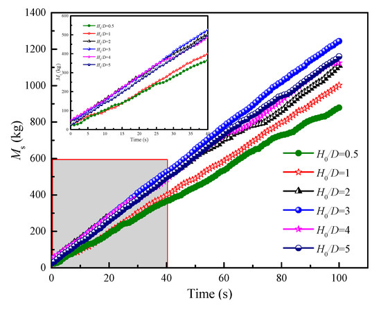 The variation in mass discharge is deemed as a barometer to indicate the flow pattern problem in VSCB because the complexity of the evolutionary dynamics of the flow pattern is notably related to the lack of effective measures to obtain some crucial parameters as an indicator of the dynamic features of the sinter granular flow pattern. To offer an elaborate effect of the aspect ratio on the performance of the granular discharge process, the scope of the aspect ratio research is extended. Figure 8 reveals a comparison of the cumulative mass as a function of time with different aspect ratios in the range from 0.5 to 5. The general trend of mass discharge with time is that the amount of mass export increases steadily with testing time. Figure 8 shows that the value of mass export in the aspect ratio of 3 is significantly higher than the corresponding value of the other five aspect ratios. The aspect ratios of 2, 4, and 5 are almost the same in mass discharge, and the results for mass discharge with different aspect ratios show the lack of a positive correlation between improving the flow pattern and the increasing aspect ratio. The quantity of mass discharge experiences a significant rise from the aspect ratio of 0.5 to 3, followed by a marked drop above the aspect ratio of 3. The above-mentioned phenomenon presents that a strategy to improve the flow pattern performance is merely dependent on increasing the filling height of VSCB, which is not an advisable choice.