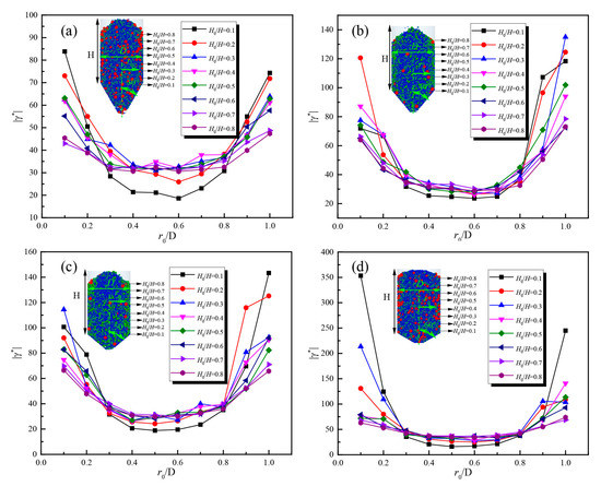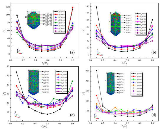 The variation in the shear rate tensor of the radius range for the entire sinter layers with different aspect ratios of (a) H/D0 = 1, (b) H/D0 = 2, (c) H/D0 = 3, and (d) H/D0 = 4.