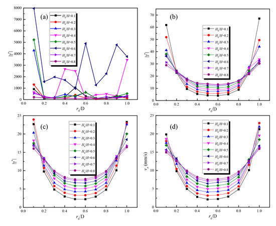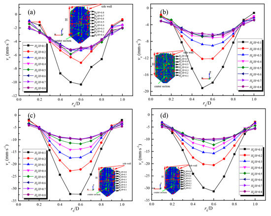 The variation in velocity profiles with different aspect ratios of (a) H/D0 = 1, (b) H/D0 = 2, (c) H/D0 = 3, and (d) H/D0 = 4.