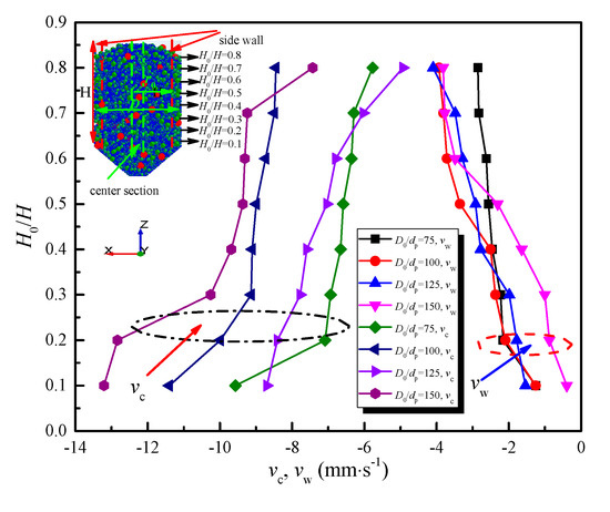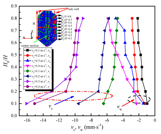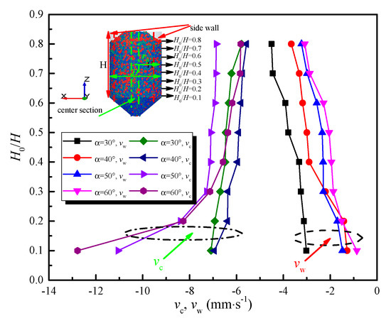 In addition to a comprehensive evaluation of the variation in the velocity distribution in the central (vc) and sidewall parts (vw), the location in the center section and sidewall of sinter layers is considered a main focus in the research domain for different half hopper angles. Figure 17 demonstrates that the magnitude of velocity in the vicinity of the sidewall gradually decreases with increases in the half hopper angle and decreases in the height of the sinter layer, while that of the variation in velocity in the center section presents an opposite trend: the magnitude of the velocity increases with the increase in the half hopper angle and the height of the sinter layer. It should be noted that the different values of velocity between the central and sidewall sections grow steeply with the decrease in the height of the sinter layer, while the flow pattern of the sinter layer experiences a transition from mass flow to funnel flow.