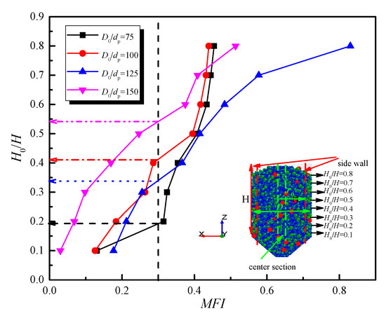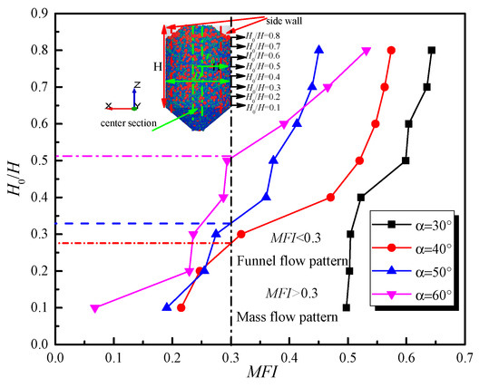 To understand the variation in the flow pattern of the sinter layer comprehensively, MFI (mass flow index) is introduced to present the dynamic transition of the flow pattern of the sinter layer during the gas–solid heat transfer process. MFI is a significant parameter applied to quantitatively and qualitatively determine the flow pattern of the sinter layer during the transition of the flow pattern. Figure 18 illustrates the variation in MFI as a function of the dimensionless height of the sinter layer for half hopper angle variations. It is evident that the height of the flow pattern in transition increases with increases in the half hopper angle, and the disparities between the magnitude of velocity in the vicinity of the sidewall and central section become greater with increases in the half hopper angle.