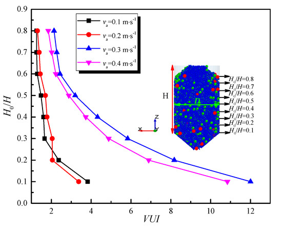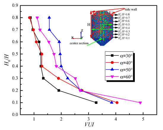 The velocity uniform index (VUI) is used to unfold the difference in velocity distribution at identical heights of the sinter layer. A lower value of VUI presents better stability of the velocity distribution in the sinter layer and is beneficial for the steady flow pattern. Figure 19 illustrates the variation in VUI as a function of the dimensionless height of the sinter layer with a varying half hopper angle. The value of VUI sharply increases with an increase in half hopper angle and a decrease in the dimensionless height of the sinter layer. The variation trend of velocity illustrates the significant fluctuation in the lower part of VSCB and the large value of the half hopper angle. The overall trend of the change in velocity in the vicinity of the sidewall declines, and the corresponding value for the central section steeply accelerates with an increase in the half hopper angle, leading to a substantial fluctuation in the magnitude of VUI with a varying half hopper angle.