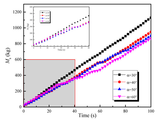 Figure 20 demonstrates the change in mass flow during the discharge process with variations in the half hopper angle; the cumulative mass flow discharge slightly increases with operating time onward and a decrease in the half hopper angle. It is possible that the mass flow of the particles close to sidewall is constrained, leading to an inevitable decrease in the cumulative mass discharge with an increase in the half hopper angle, but the rate of decrease in mass flow is reduced due to the capacity of half hopper angle restriction on variations in the decrease in velocity in the vicinity of the sidewall with an increase in the half hopper angle.