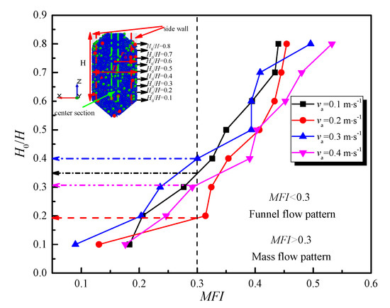 Furthermore, the MFI (mass flow index) is introduced to describe the evolution of the flow pattern for quality and quantity analysis of the sinter particle flow performance. The criterion for determining the transition in the granular flow pattern with the help of MFI is as follows: MFI > 0.3 is the mass flow pattern, below which the flow pattern transitions from mass to funnel flow. The MFI is determined by the ratio of granular velocity near the wall and central section, and the equation for the mass flow index (MFI) is illustrated as follows.