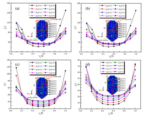 The variation in shear rate in sinter layers with different normalized outlet scales of (a) d0/D0 = 0.1, (b) d0/D0 = 0.2, (c) d0/D0 = 0.3, and (d) d0/D0 = 0.4.