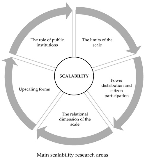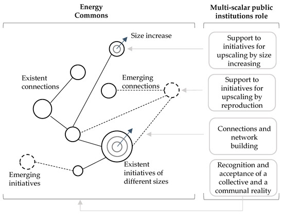 In the scaling of common initiatives by way of expansion or reproduction, public institutions in their multi-scale approach can become catalysts. The United Nations recognised this ability in the implementation of its Sustainability Development Goals [69], provided that public institutions are aligned and coordinated in their multi-scale approach [70,71]. The alignment of the public at its various scales, coupled with the recognition and support of a community-based reality could become one of the core elements of scalability.