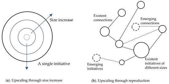 An important question is whether this distribution of power over the good and over the resources for its production is feasible during both upscaling through size increase (Figure 2a: when an initiative in itself grows) and upscaling through reproduction (Figure 2b: when initiatives, each with its own size, act as a network). From a different perspective, it is worth asking whether it is necessary to sacrifice a certain degree of distributive power in order to respond to those global-scale issues.
