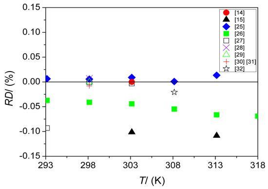 Comparison of the speed of sound in 1-butanol as a function of temperature under atmospheric pressure obtained in this work (uthis work) with the literature values (ulit) [14,15,25,26,27,28,29,30,31,32] presented as relative deviations RDs (RD/% = 100·(uthis work−ulit)/uthis work).