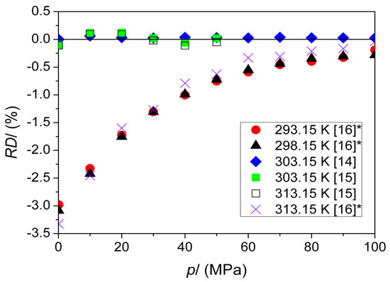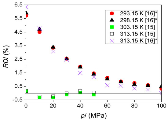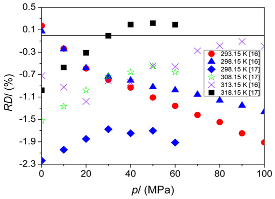 Comparison of the density of 1-butanol as a function of pressure obtained in this work (ρthis work) with the literature values (ρlit) [16,17,19] presented as relative deviations RDs (RD/% = 100·(ρthis work−ρlit)/ρthis work).
