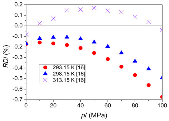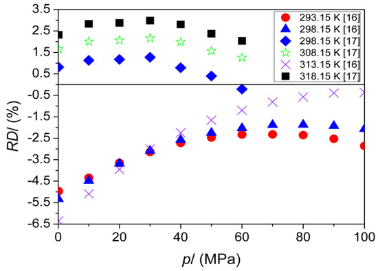 The speed of sound in 1-butanol was measured from (293 to 318) K in about 5 K steps and under the pressures up to 101.34 MPa. The experimental values are listed in Table 2. The relative deviations RDs between the high-pressure speed of sound obtained of this work and literature values are in the range from 0.12% [15] to −3.3% [16] (see Figure 3). Additionally, the absolute average relative deviations (AARDs) between results obtained in this work (yexp) and the literature values (ylit) were calculated as (where N is the number of data points). The AARDs equal 0.03% [14], 0.08% [15], and 1.1% [16].