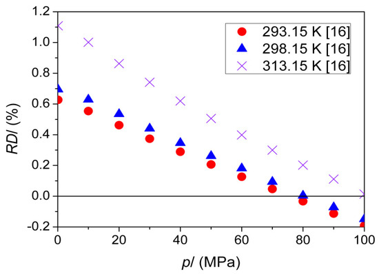 Based on the temperature dependence of density, the isobaric thermal expansion was calculated using a definition (Equation (4)). The obtained results are collected in Table 8. The overall expanded uncertainty of αp is U(αp) = 1·10−2αp K−1. The agreement with literature data is very good, the RDs are in the range from −1.9 to 0.17% [16] and from −2.2 to 0.19% [17] (see Figure 7). The AARD is 0.83% [16] and 1.0% [17].