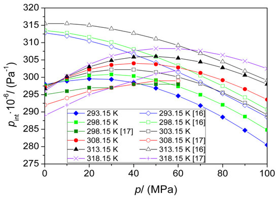 The internal pressure is related to the solubility parameter [42,43,44,45,46,47,48] and cohesive energy density [43,46,49]. According to the definition, the internal pressure reflects molecular interactions which determine the change of internal energy that accompanying a very small isothermal expansion of 1 mole of liquid. Therefore, the internal pressure should be affected mainly by dispersion, repulsion, and weak dipole–dipole interactions. Kartsev et al. [50,51,52,53] pointed out that the temperature dependence of internal pressure is sensitive to the structural organization and reflects the character of the interactions of not hydrogen-bonded, hydrogen-bonded with the spatial net of H-bonds and associated liquids. They showed that, at atmospheric pressure, the sign reversal of the temperature coefficient of the internal pressure from (∂pint/∂T)p > 0 to (∂pint/∂T)p< 0 is characteristic for primary linear alkanols. Our group found that the pressure coefficient of internal pressure (∂pint/∂p)Tis also sensitive to the structural organization of the molecular liquids like alcohols [20,54,55] as well as ionic liquids [56] and reflects the character of the interactions. The temperature and pressure dependence of the internal pressure of 1-butanol found in this work confirms the results obtained previously for 1-alkanols [20,54,55]. In the temperature and pressure ranges under investigation, the maximum of the pressure dependence of the internal pressure of 1-butanol was observed for each isotherm (see Figure 16). With increasing temperature, the maximum moves toward higher pressures. Thus, the internal pressure first increases with increasing pressure and then it decreases. This was also observed for ethanol and for other 1-alkanols from 1-pentanol to 1-decanol [20,54,55]. The internal pressure of 1-butanol obtained by Safarov et al. [16] decreases with increasing pressure ((∂pint/∂p)T < 0) in the pressure range under investigation and at temperatures as in this work. Meanwhile, the internal pressure of 1-butanol obtained by Dávila et al. [17] increases with increasing pressure ((∂pint/∂p)T > 0) in the pressure range under investigation and at temperatures as in this work. Moreover, the results obtained in this work shows that with the increasing pressure, the temperature dependence of the internal pressure of 1-butanol changes from (∂pint/∂T)p < 0 to (∂pnt/∂T)p > 0. This reflects the crossing point of the isotherms of the internal pressure, which was observed for ethanol and for other 1-alkanols from 1-pentanol to 1-decanol [20,54,55]. Dávila et al. [17] also found the crossing point of internal pressure isotherms of 1-butanol. On the other hand, Safarov et al. [16] did not observe this effect; (∂pint/∂T)p > 0 in the whole pressure range. The inspection of literature data shows better internal coherence of pint(p,T) dependence obtained by the acoustic method than obtained by the densimetric method. In the case of the densimetric method, isobaric thermal expansion and isothermal compressibility are obtained by differentiation using their definitions acquired by Equations (4) and (6), respectively. Meanwhile, in the acoustic method, differentiation is needed only for the determination of isobaric thermal expansion (Equation (4)). The crossing point of the internal pressure isotherms was also observed for 2-methyl-2-butanol and 3-pentanol [54,55]. For 3-pentanol, the crossing point of each two neighbor isotherms shifts toward higher pressure with increasing temperature [54,55]. For 2-methyl-2-butanol, the crossing point of each two neighbor isotherms appears at temperatures higher than 303.15 K and it moves toward higher pressure with increasing temperature as in the case of 3-pentanol [55]. On the other hand, for 2-methyl-1-butanol, the crossing point is not observed, and the internal pressure increases with increasing temperature over the whole investigated temperature and pressure range. However, the temperature dependence of the internal pressure of 2-methyl-1-butanol under atmospheric pressure indicates that the crossing point could appear at higher temperatures [55].